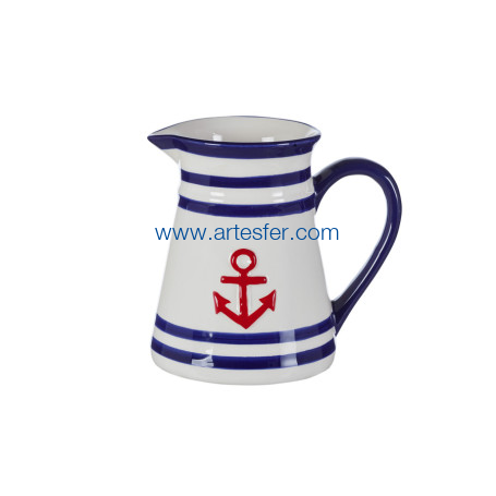 Jarra decorativa marinera – Cerámica esmaltada con relieves náuticos. Aporte un toque fresco y costero a su oferta con esta encantadora jarra decorativa de estilo marinero. Fabricada en cerámica esmaltada. Su asa práctica y su diseño detallado la hacen apta tanto como pieza útil como decorativa. Ideal para escaparates veraniegos, decoración náutica o colecciones temáticas.