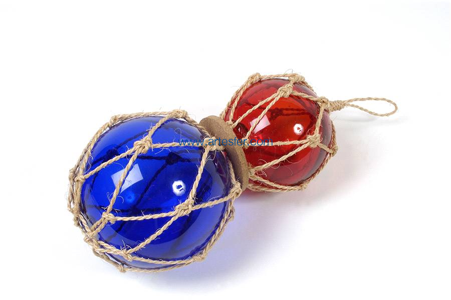 Dos boyas de pesca azul y roja. La boya de pesca era un antiguo flotador constituido de una bola de vidrio envuelta de una cuerda trenzada. Se utilizó hasta los años 50. Estos flotadores se fijaban en las redes de pesca para que se mantuvieran en la superficie mientras derivaban por la corriente.