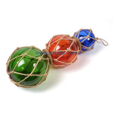 Tres boyas de pesca azul, roja y verde. La boya de pesca era un antiguo flotador constituido de una bola de vidrio envuelta de una cuerda trenzada. Se utilizó hasta los años 50. Estos flotadores se fijaban en las redes de pesca para que se mantuvieran en la superficie mientras derivaban por la corriente.