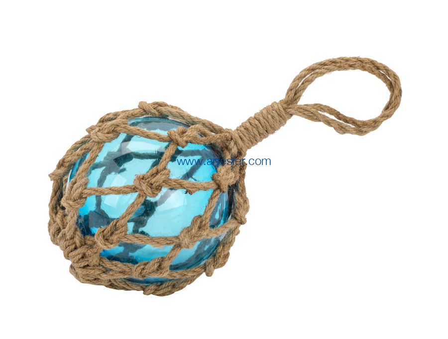 Boya de pesca de color aguamarina. La boya de pesca era un antiguo flotador constituido de una bola de vidrio envuelta de una cuerda trenzada. Se utilizó hasta los años 50. Estos flotadores se fijaban en las redes de pesca para que se mantuvieran en la superficie mientras derivaban por la corriente.