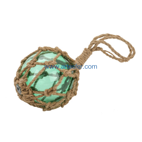 Boya de pesca de color turquesa. La boya de pesca era un antiguo flotador constituido de una bola de vidrio envuelta de una cuerda trenzada. Se utilizó hasta los años 50. Estos flotadores se fijaban en las redes de pesca para que se mantuvieran en la superficie mientras derivaban por la corriente.