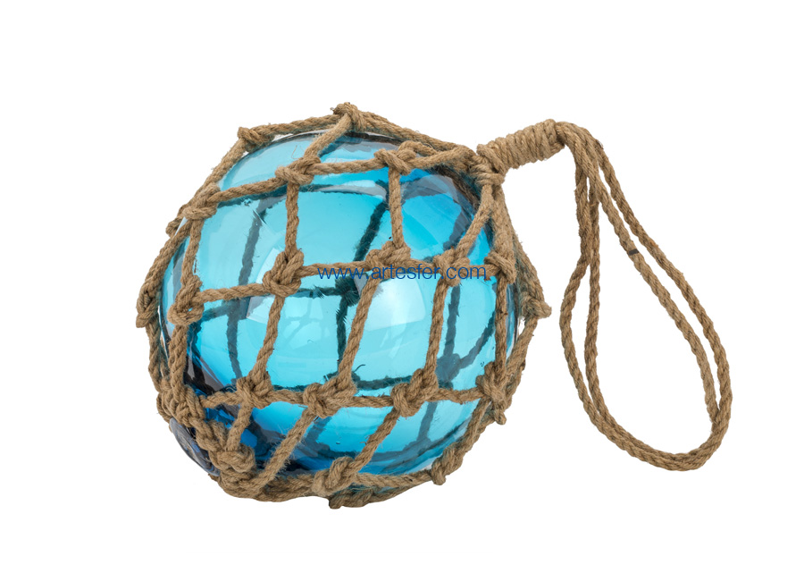 Boya de pesca de color aguamarina. La boya de pesca era un antiguo flotador constituido de una bola de vidrio envuelta de una cuerda trenzada. Se utilizó hasta los años 50. Estos flotadores se fijaban en las redes de pesca para que se mantuvieran en la superficie mientras derivaban por la corriente.