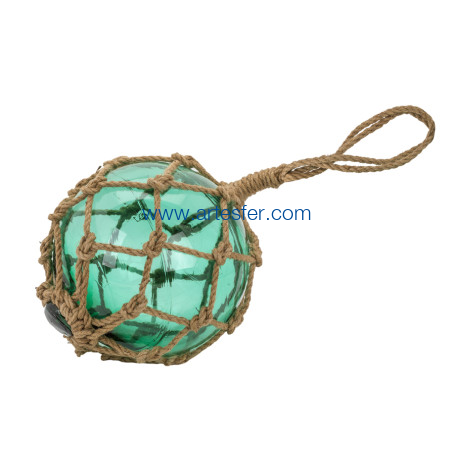 Boya de pesca de color turquesa. La boya de pesca era un antiguo flotador constituido de una bola de vidrio envuelta de una cuerda trenzada. Se utilizó hasta los años 50. Estos flotadores se fijaban en las redes de pesca para que se mantuvieran en la superficie mientras derivaban por la corriente.