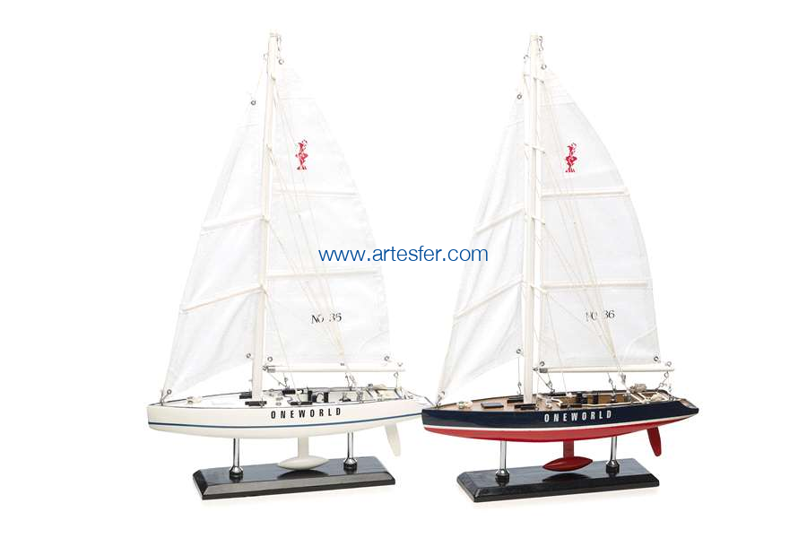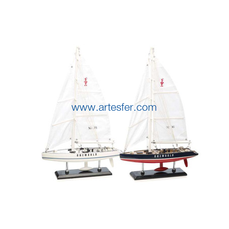 Reproducción de dos veleros de la Copa de América (America's Cup), regata creada en 1851 tras un reto lanzado entre los cargadores de muelle americanos a los británicos del Royal Yacht Club. Es el trofeo más antiguo todavía hoy disputado. Tiene lugar cada 3 o 4 años. Conjunto de dos maquetas artesanas decorativas realizadas en madera y pintadas.