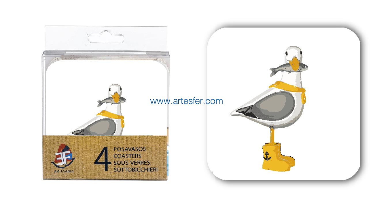 Estás aquí: Productos > Decoración del hogar > Complementos para la mesa > Set de 4 posavasos "gaviota con sardina"