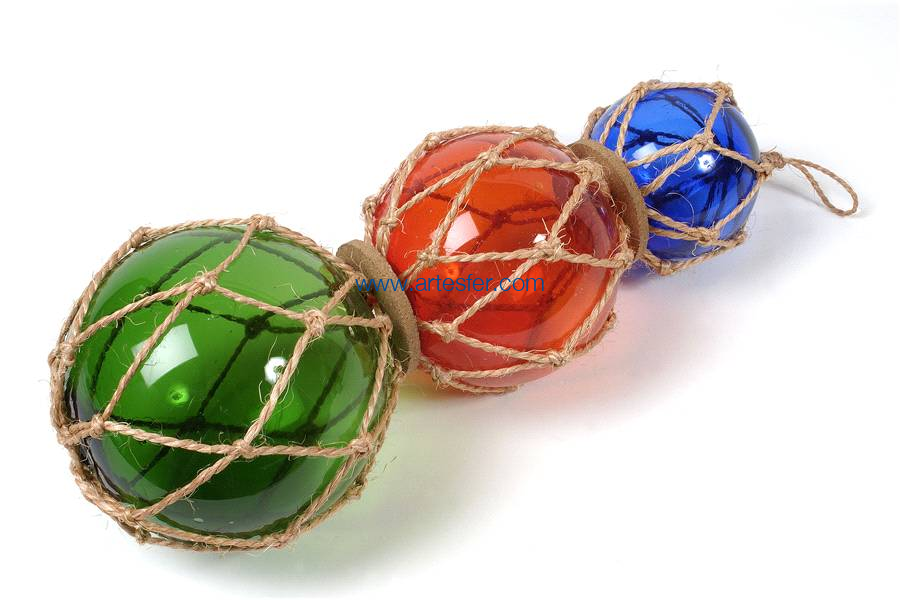 Tres boyas de pesca azul, roja y verde. La boya de pesca era un antiguo flotador constituido de una bola de vidrio envuelta de una cuerda trenzada. Se utilizó hasta los años 50. Estos flotadores se fijaban en las redes de pesca para que se mantuvieran en la superficie mientras derivaban por la corriente.