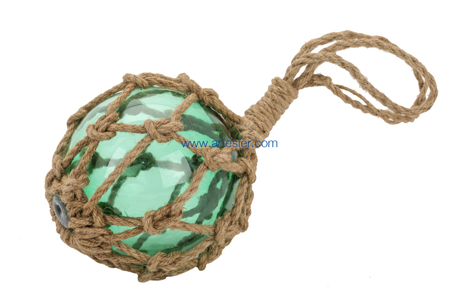 Boya de pesca de color turquesa. La boya de pesca era un antiguo flotador constituido de una bola de vidrio envuelta de una cuerda trenzada. Se utilizó hasta los años 50. Estos flotadores se fijaban en las redes de pesca para que se mantuvieran en la superficie mientras derivaban por la corriente.