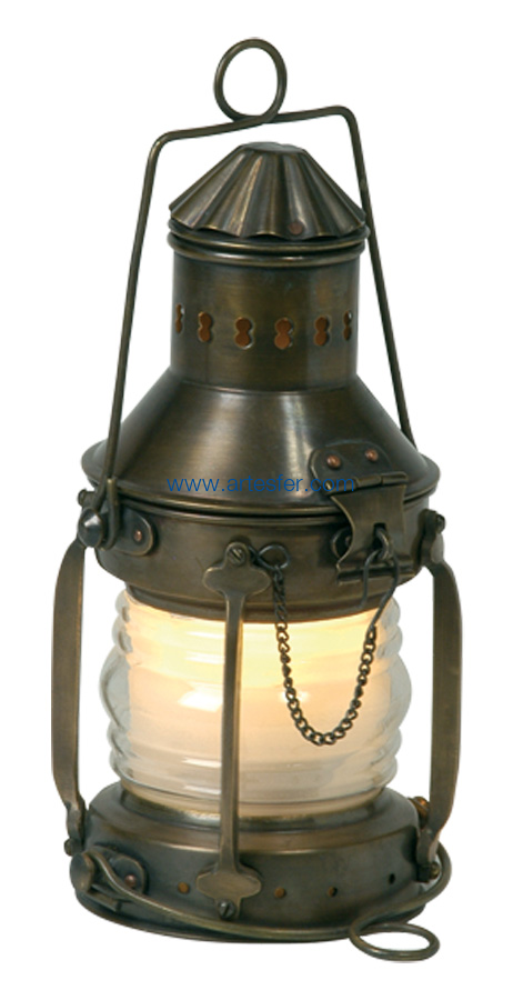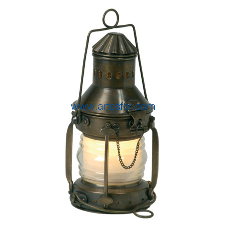 Farol de fondeo eléctrico, equipado de su lente de Fresnel. Antes de que la electricidad apareciese en los barcos, las luces eran de petróleo. Tenían entonces una pequeña chimenea para la evacuación del humo. Para aumentar la lumbre de las llamas se utilizaron los vidrios de Fresnel que actuaban como lupa.