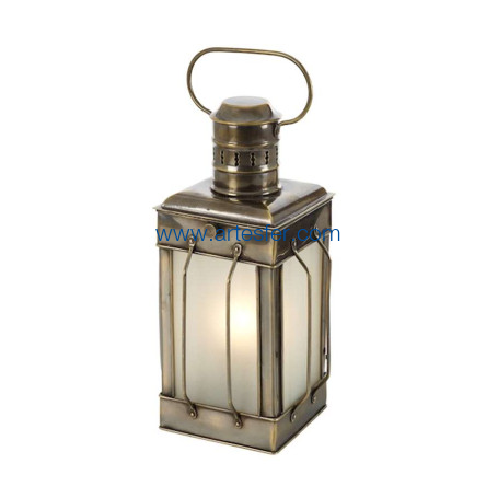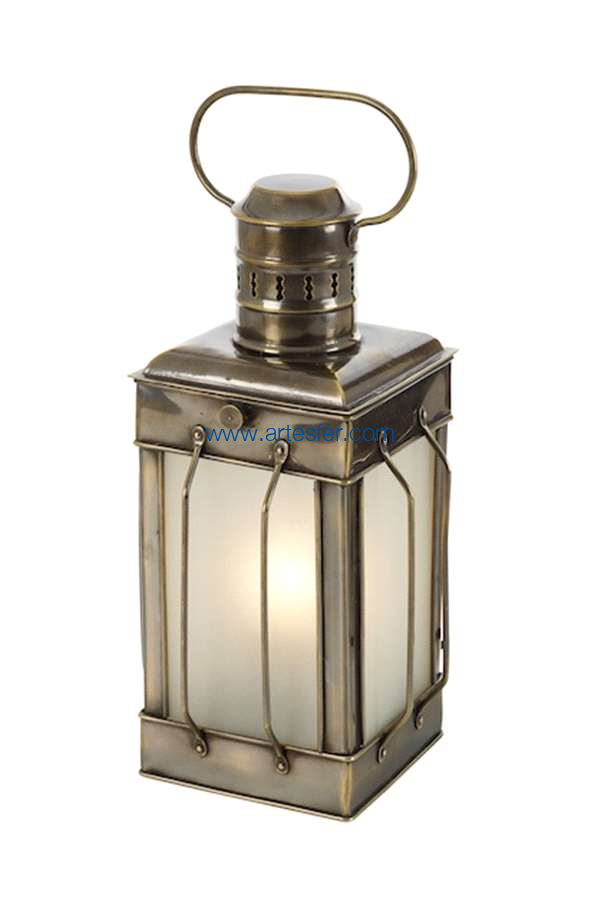 Reproducción de una lámpara de queroseno utilizada en el siglo XIX en los cargueros. Antes de que la electricidad apareciese en los barcos, las luces eran de petróleo. Tenían entonces una pequeña chimenea para la evacuación del humo. Lámpara náutica de mesa en latón envejecido con sus 4 cristales esmerilados.