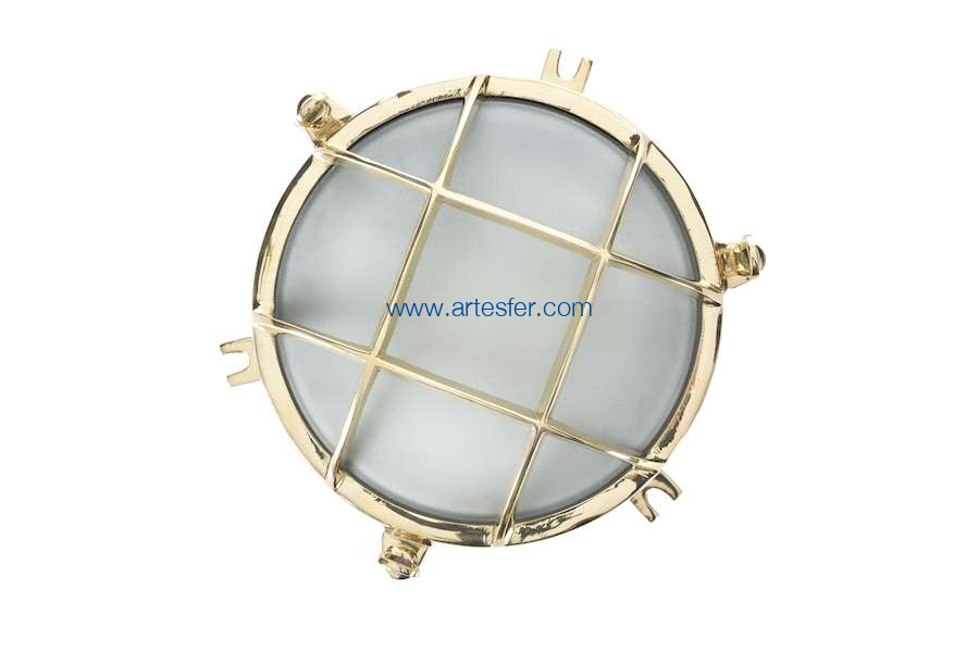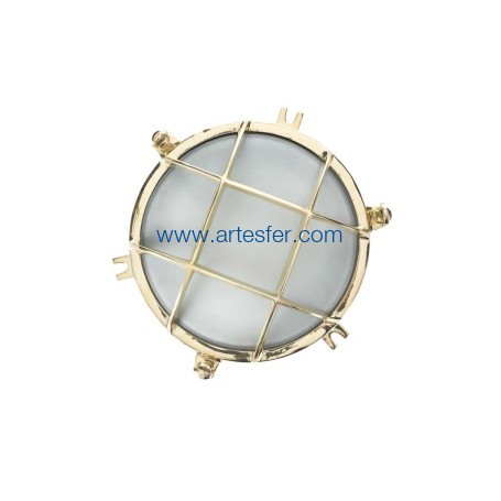 Reproducción de una lámpara náutica utilizada para alumbrar el paso entre las cabinas o los equipamientos de un navío permitiendo una mejor circulación. Aplique mural eléctrico en latón con un cristal esmerilado protegido pour una rejilla y fijado por tuercas mariposa. De uso interior.