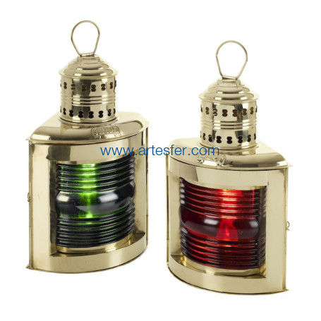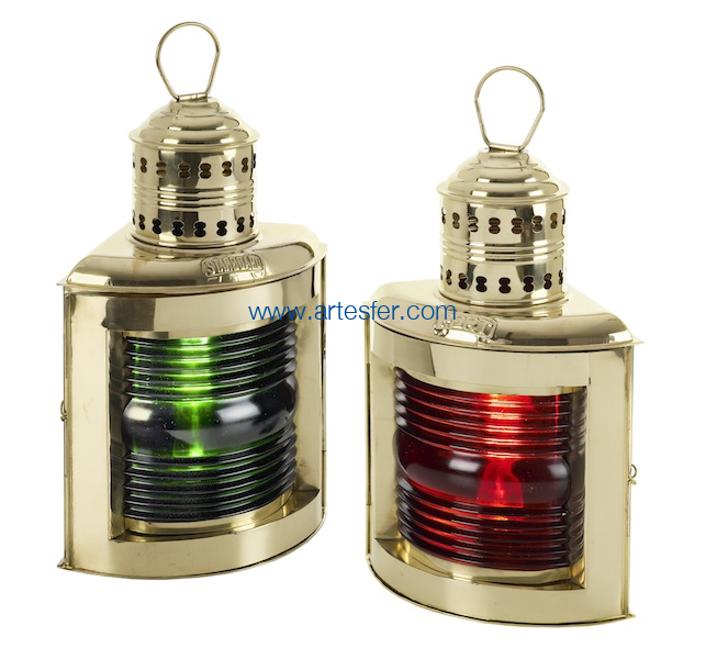 Luces de navegación de queroseno, estribor (verde) y babor (roja), realizadas en latón y equipadas de su lente de Fresnel. Antes de que la electricidad apareciese en los barcos, las luces eran de petróleo. Tenían entonces una pequeña chimenea para la evacuación del humo. Para aumentar la lumbre de las llamas se utilizaron los vidrios de Fresnel que actuaban como lupa. Lámparas náuticas de mesa o para colgar, equipadas de una lengüeta de fijación.