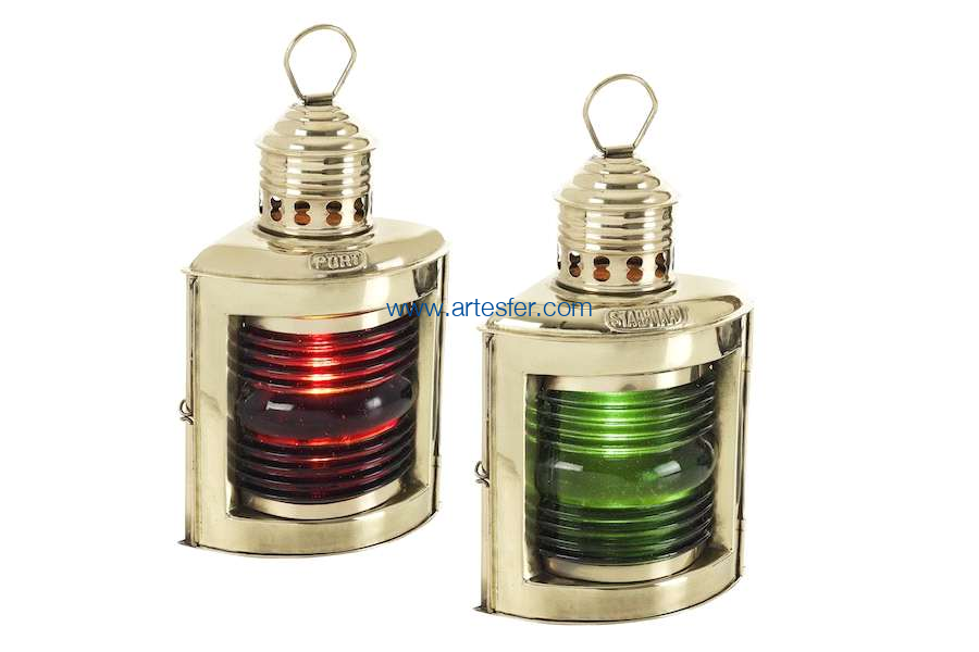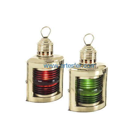 Lámparas inspiradas de las luces de navegación de queroseno, estribor (verde) y babor (roja), realizadas en latón y equipadas de su lente de Fresnel. Antes de que la electricidad apareciese en los barcos, las luces eran de petróleo. Tenían entonces una pequeña chimenea para la evacuación del humo. Para aumentar la lumbre de las llamas se utilizaron los vidrios de Fresnel que actuaban como lupa.