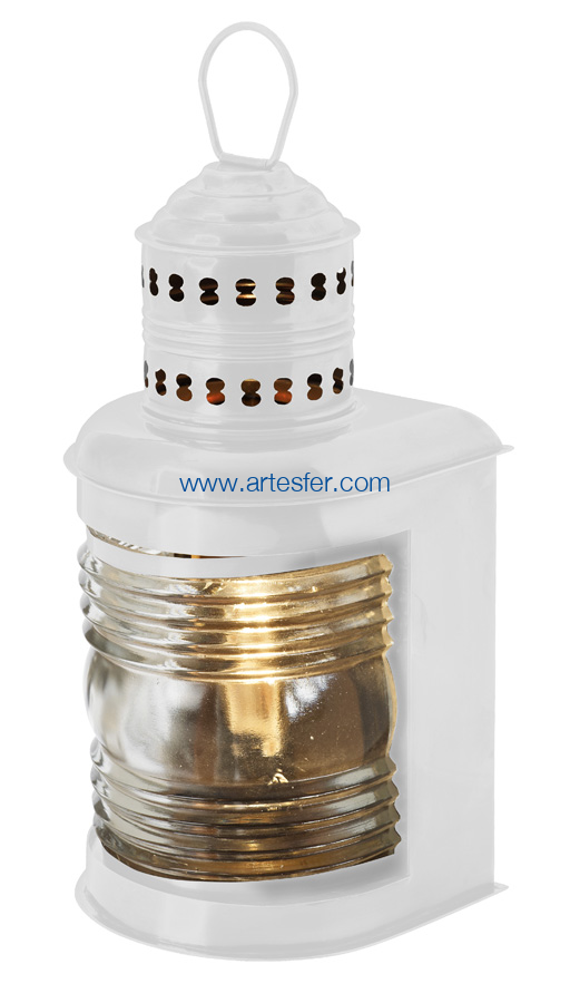 Esta linterna de inspiración náutica está fabricada en latón pintado, con un frontal acanalado que recuerda a las antiguas lámparas de navegación. Ideal para dar un toque marinero auténtico a un escaparate o una decoración interior.