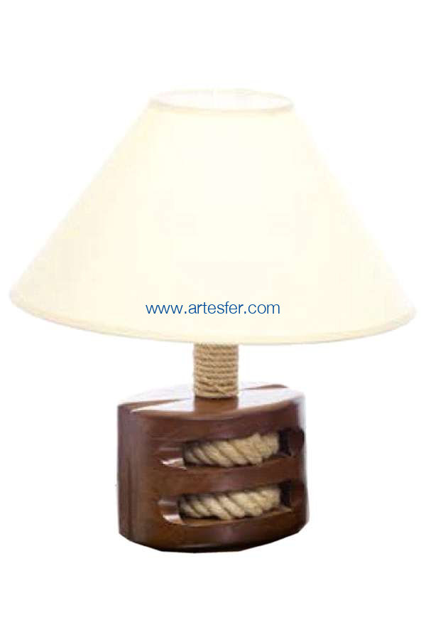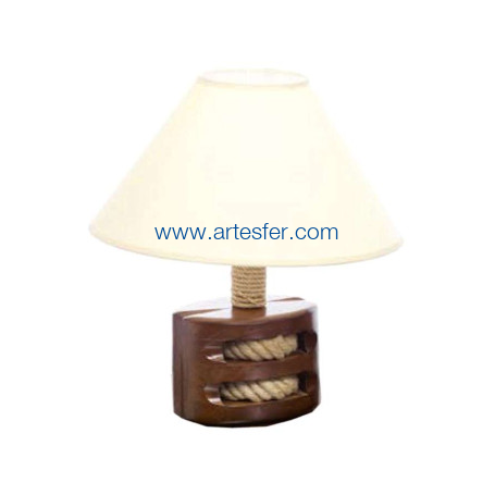Lámpara polea. Lámpara de decoración marina en forma de polea doble, en madera, patinada a la antigua.