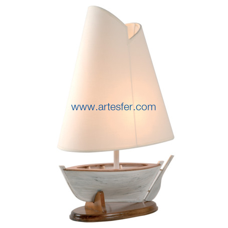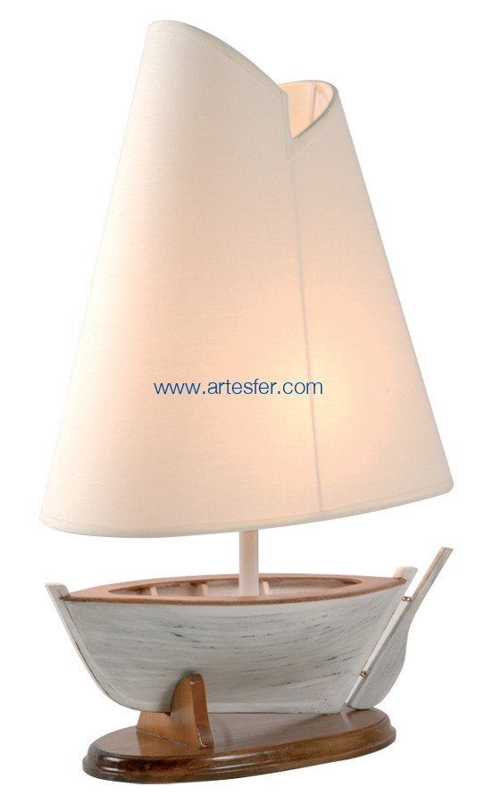 Lámpara barco. Original lámpara náutica realizada a partir de un casco de barco en madera de pino y DM del cual se alza su vela.