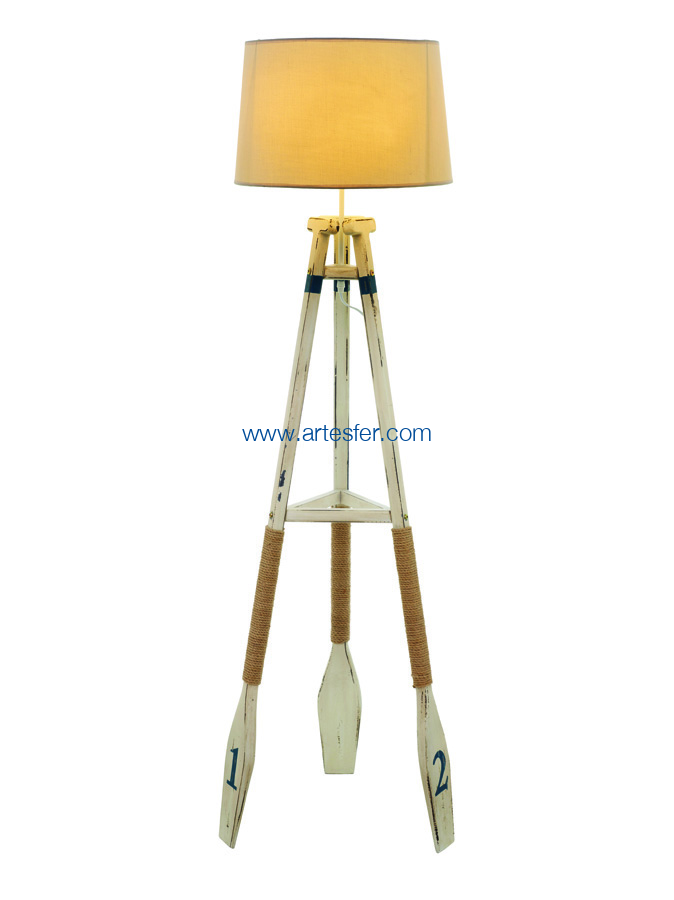 Lámpara trípode hecho con tres remos de barco de color blanco y azul. Bonita lámpara náutica, ideal para la decoración marina en la casa.