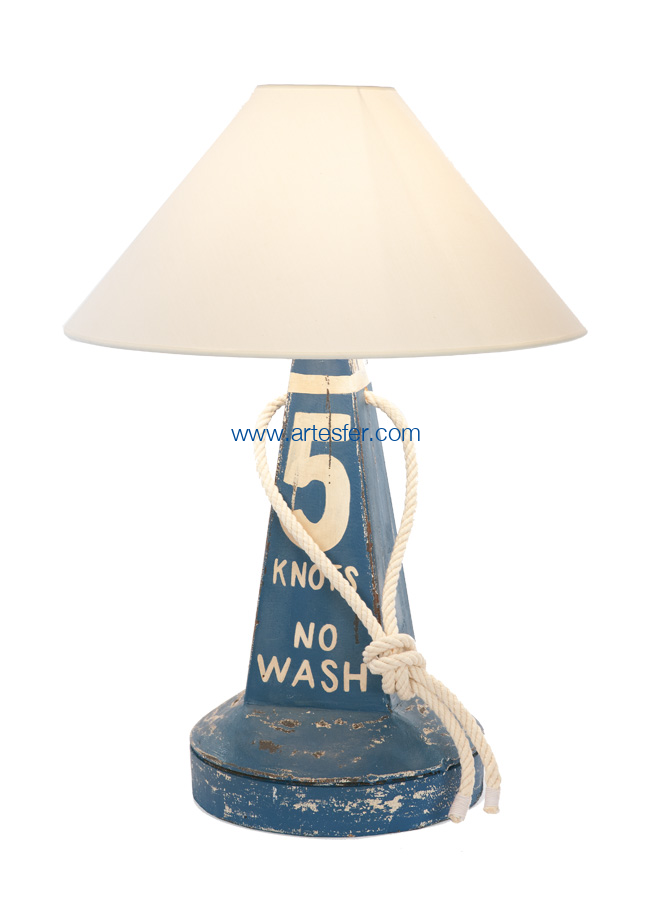 Lámpara baliza inspirada de las boyas de balizamiento marítimas flotantes. Lámpara náutica decorativa de madera, pintada y decorada a mano con su cuerda de algodón.
