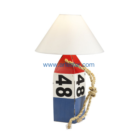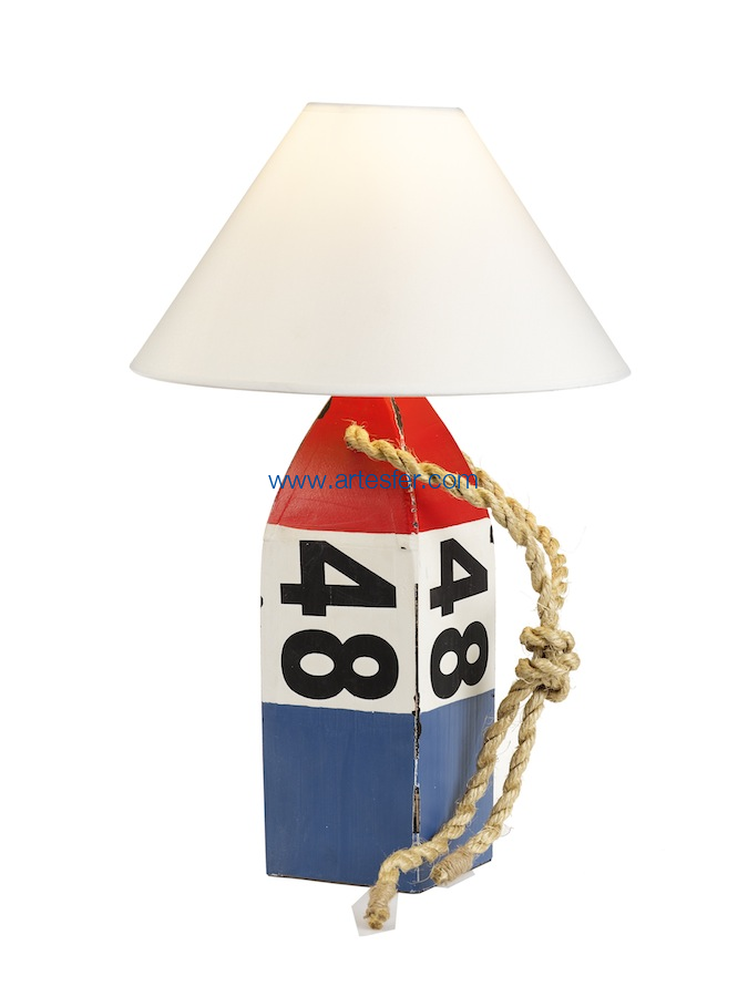 Lámpara baliza inspirada de las boyas de balizamiento marítimas flotantes. Lámpara náutica decorativa de madera, pintada y decorada a mano con su cuerda de algodón.