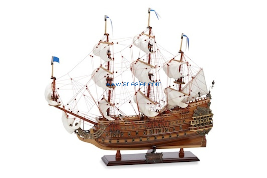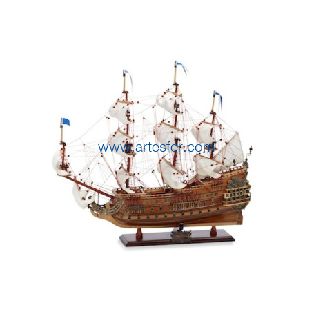 El Soleil Royal (1669), navío de guerra francés, construido en los astilleros navales de Brest, es un barco de línea de segunda fila de 80 cañones. Conoce su poder y su gloria cuando el 29 de mayo del 1692, dirigido por el almirante Tourville, el "Soleil Royal" sale al mar con una escuadra de 45 barcos a la punta de Barfleur. El barco derrota 97 navíos ingleses y holandeses. Maqueta decorativa con acabados de una gran calidad realizada en madera, barnizada y completamente montada de forma artesanal.Embalaje en caja individual.