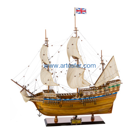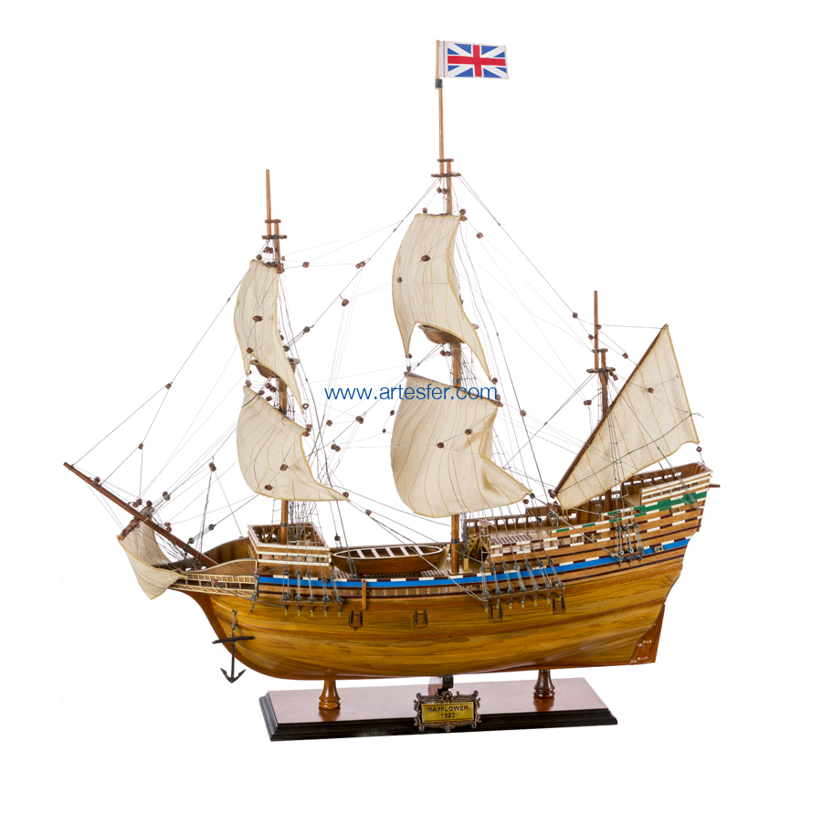 El Mayflower era un galeón inglés de principios del siglo XVII, conocido por haber transportado a los Peregrinos desde Inglaterra al Nuevo Mundo en 1620. Aunque no se conocen las dimensiones exactas del barco, se estima que medía aproximadamente 27 metros de largo, 7,6 metros de ancho y tenía un tonelaje de unas 180 toneladas. Modelo decorativo con acabados de alta calidad. Trabajo artesano. Fabricado en madera barnizada y totalmente montado a mano