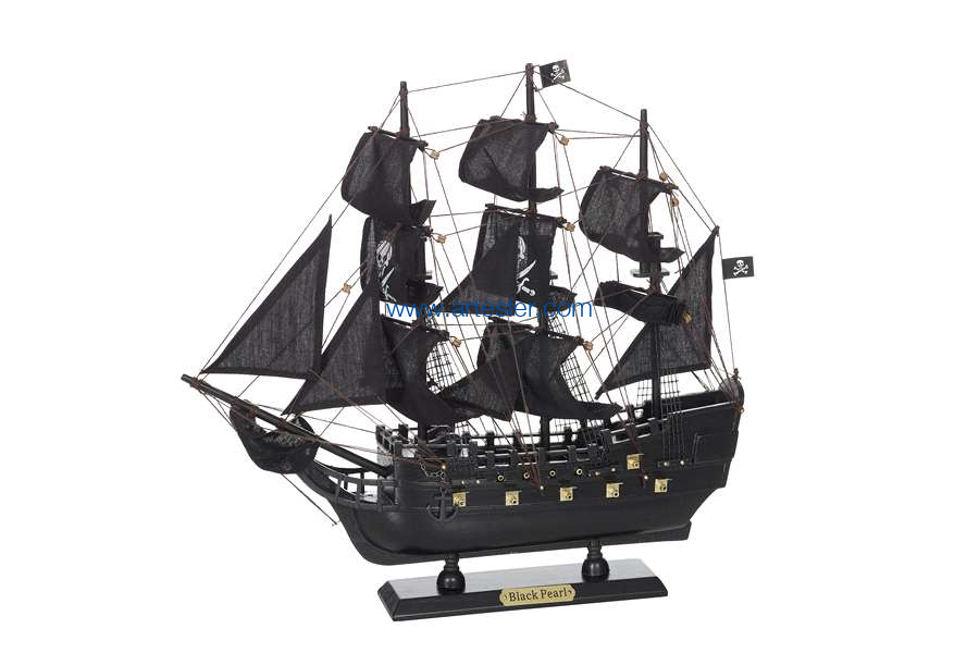 Maqueta inspirada del "Black Pearl" o "La perla negra", navío ficticio de tipo "indiaman" (finales del S XVIII-principios del S XIX) que aparece en las películas de aventuras de Piratas del Caribe y que se convierte en el escenario fascinante de numerosas intrigas, batallas de corsarios y piratas, búsqueda de tesoros, maldiciones, motines, traiciones y conquistas. Maqueta decorativa realizada en madera, pintada y completamente montada. Las singulares velas negras con sus dibujos de pirata son de algodón. Entregada completamente montada y embalada en caja individual.