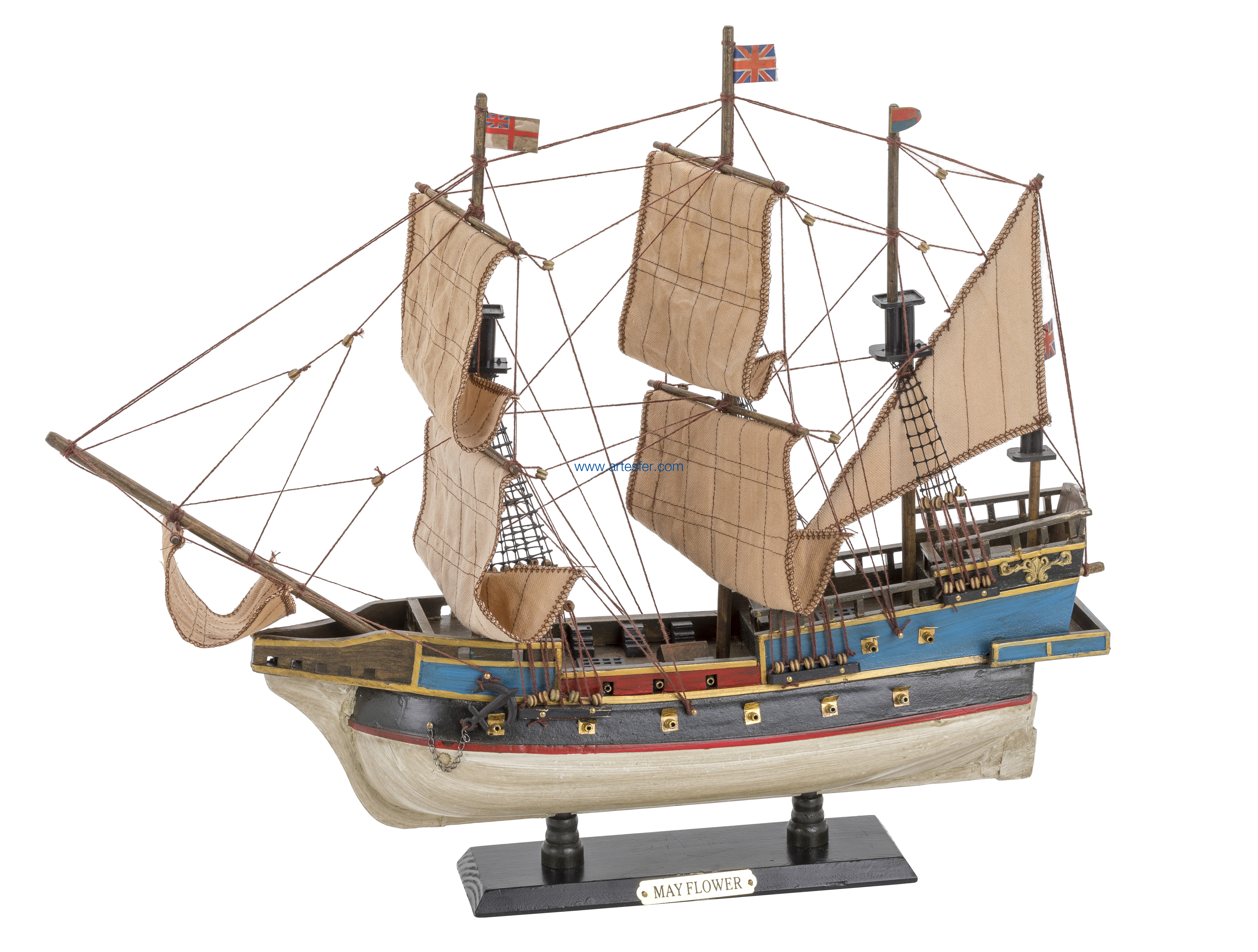 El Mayflower era un galeón mercante de tres mástiles, con una longitud aproximada de 30 metros y una anchura de 7,5 metros, y una capacidad de carga estimada en 180 toneladas.?Maqueta decorativa realizada en madera pintada y completamente montada de forma artesanal.?Embalaje en caja individual.