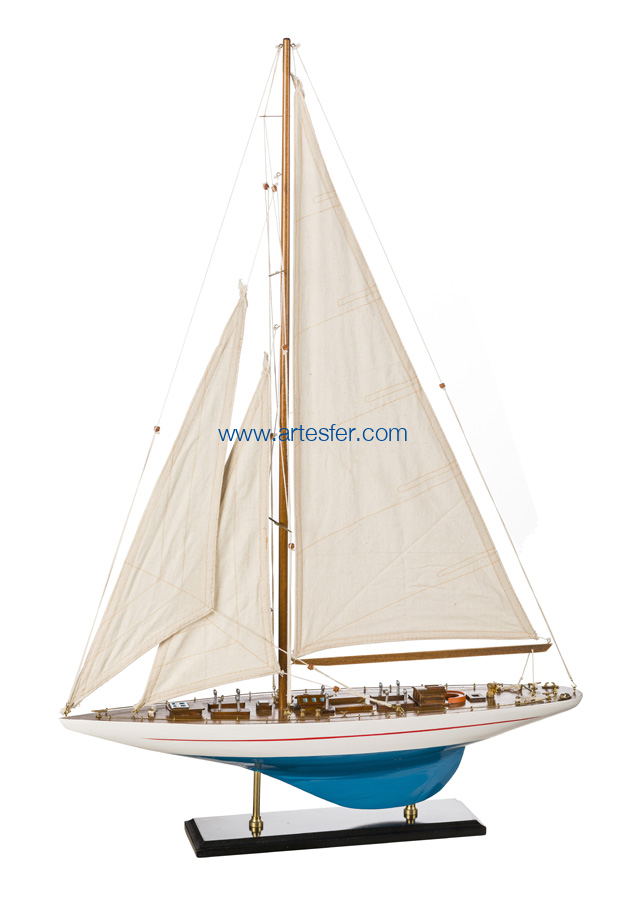 Maqueta artesanal de un elegante velero clásico con casco azul y velas de tela natural, montado sobre base de madera barnizada. Su diseño equilibrado y su alto nivel de detalle lo convierten en una pieza decorativa perfecta para ambientes marineros, escaparates temáticos o colecciones de inspiración náutica.