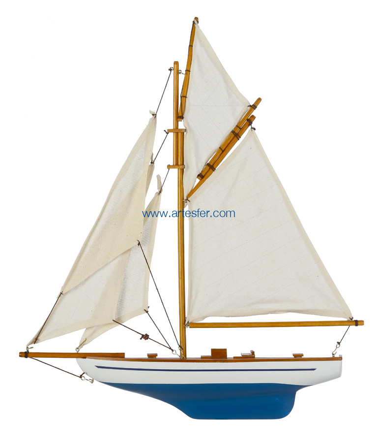 Maqueta decorativa en media quilla que representa un velero clásico. Estos modelos están hechos de madera, pintados a mano y diseñados para colgarse en la pared, aportando un toque náutico elegante a cualquier interior. Se utilizan a menudo como elementos decorativos en entornos marítimos o por entusiastas del modelismo naval. Fabricado en madera. Trabajo artesano. Embalaje: Mástil desmontado. Barco entregado en caja individual.