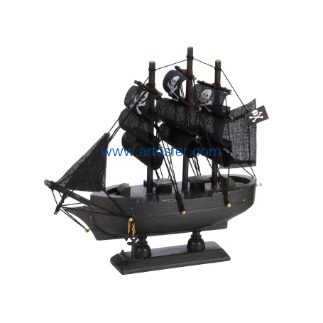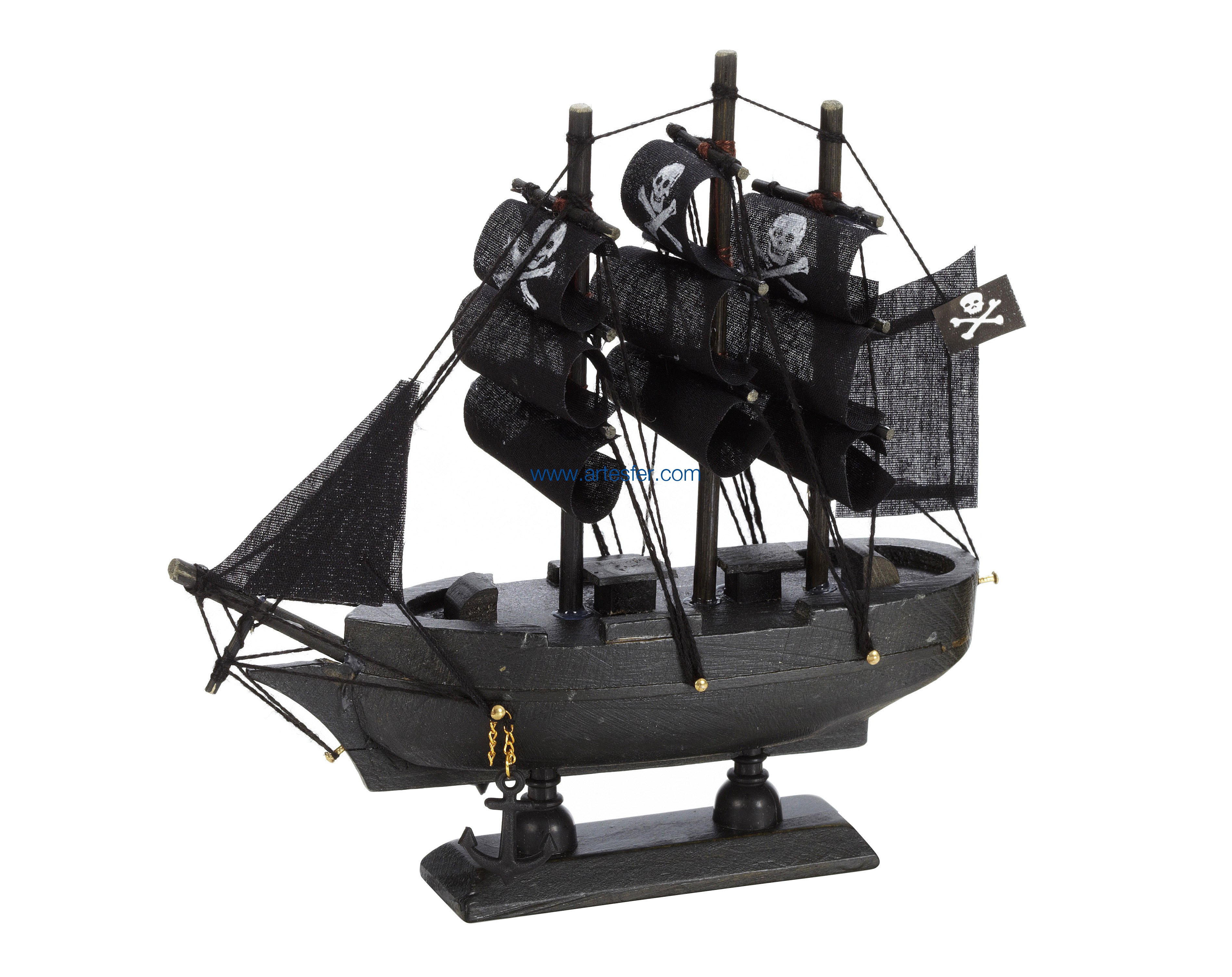 Maqueta inspirada del "Black Pearl" o "La perla negra", navío ficticio de tipo "indiaman" (finales del S XVIII-principios del S XIX) que aparece en las películas de aventuras de Piratas del Caribe y que se convierte en el escenario fascinante de numerosas intrigas, batallas de corsarios y piratas, búsqueda de tesoros, maldiciones, motines, traiciones y conquistas. Maqueta decorativa realizada en madera, pintada a mano. Las singulares velas negras con sus dibujos de pirata son de algodón.