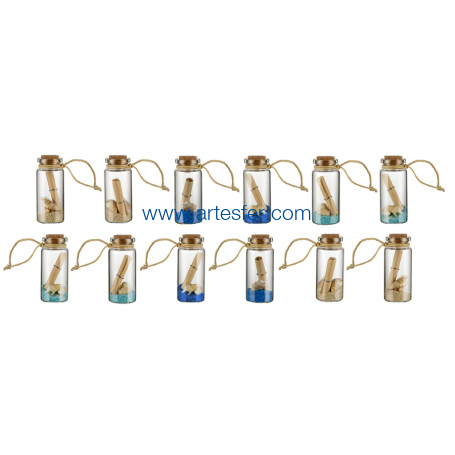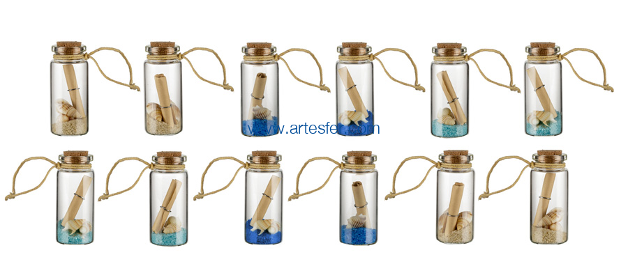 Botellita con arena, caracoles marinos y pergamino