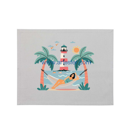 Estás aquí: Productos > Textil nautico > Textil para la casa > Mantel individual"bañista en hamaca, palmeras y faro"